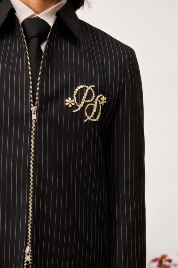 Crafted from premium suiting fabric in a black striped pattern, this