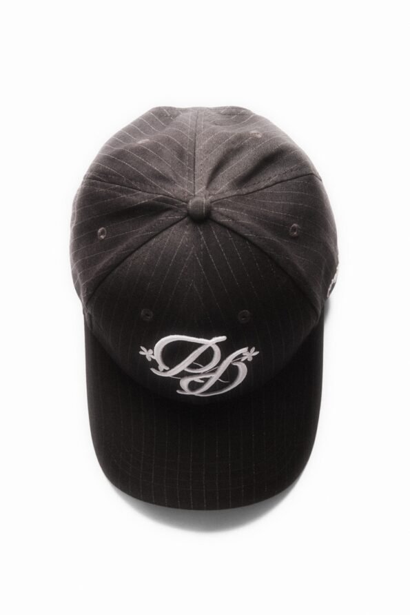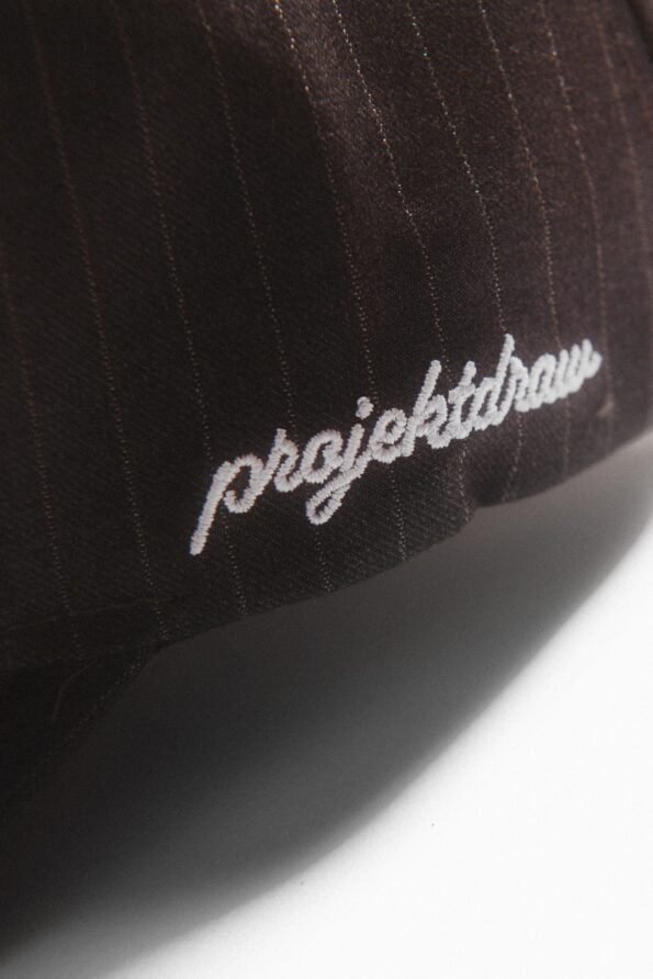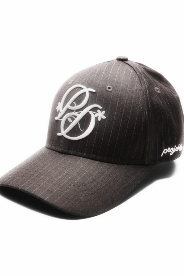 Grey striped cap with puff PD signature embroidery. Finished with subtle projektdraw detailing on the side.