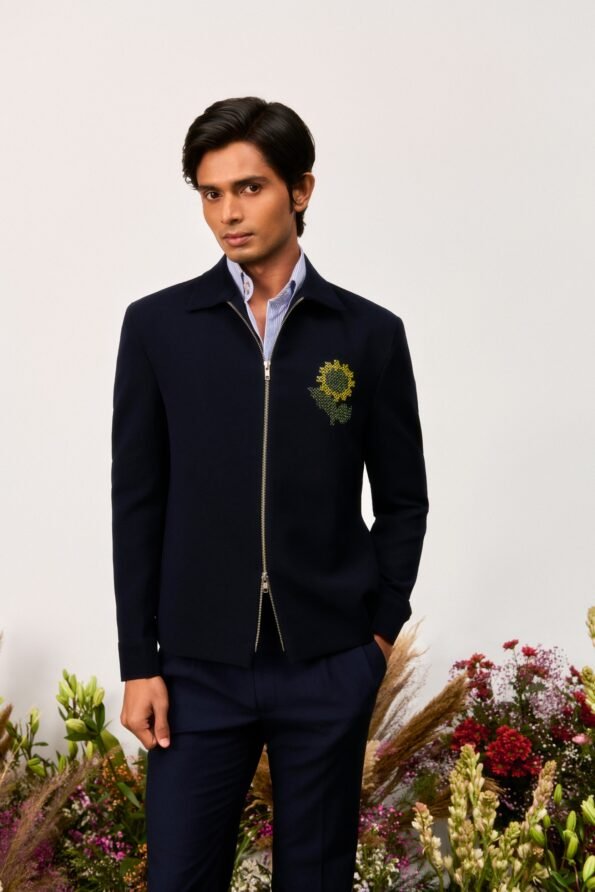 Crafted from premium TR fabric, this jacket features a double zipper closure. The front showcases our signature cross-stitch sunflower hand embroidery done using cutdanas and beads. The back is detailed with