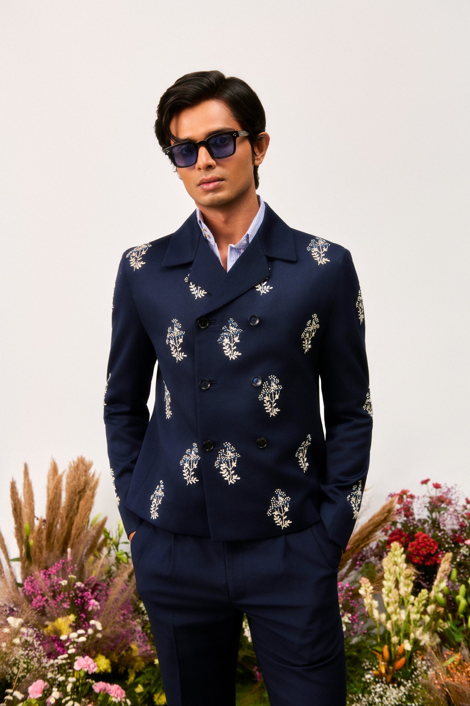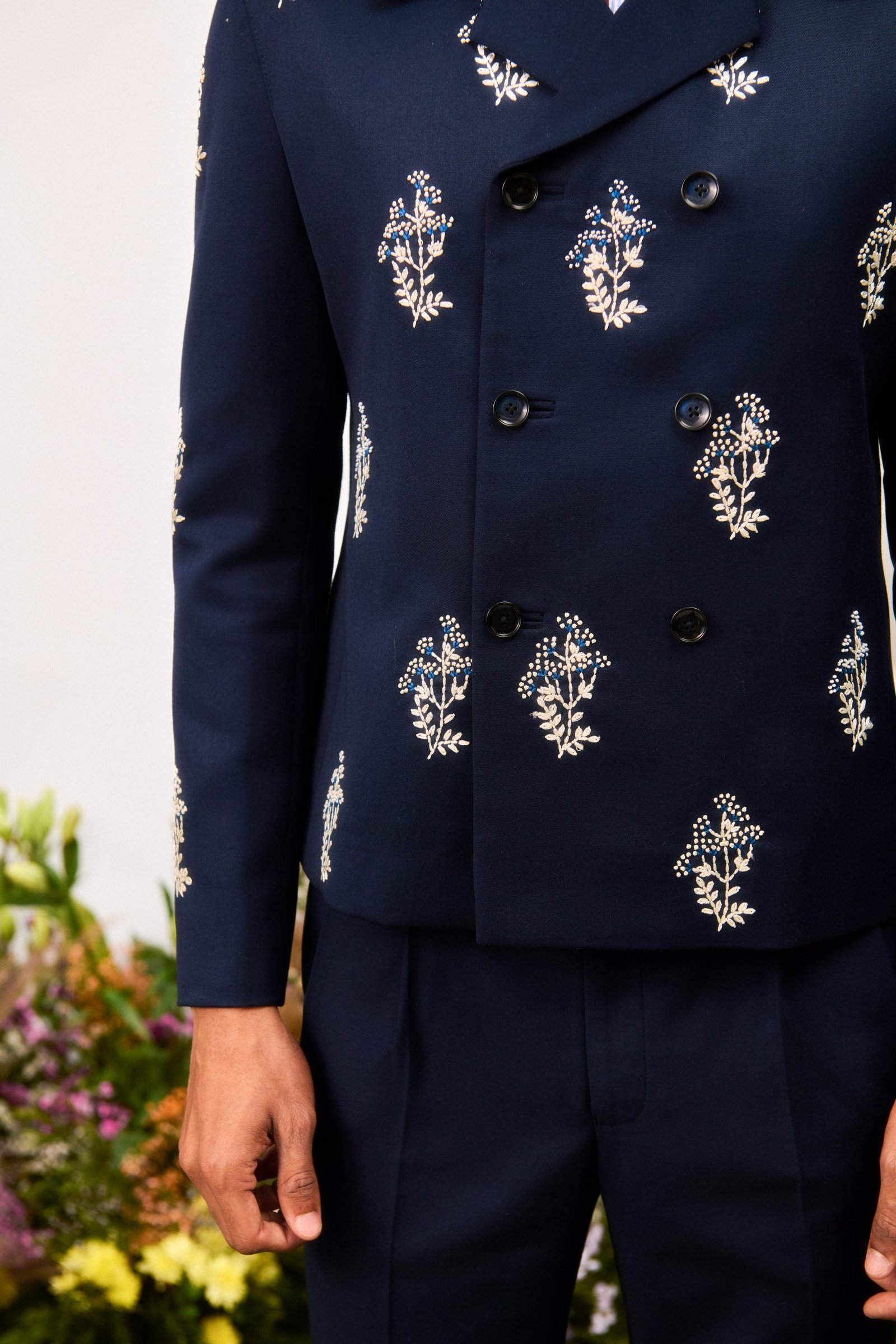 Crafted from premium suiting fabric in terry wool, this Cuban collar jacket features a six-button front closure. It is detailed with small hand embroidered flowers all over the jacket.