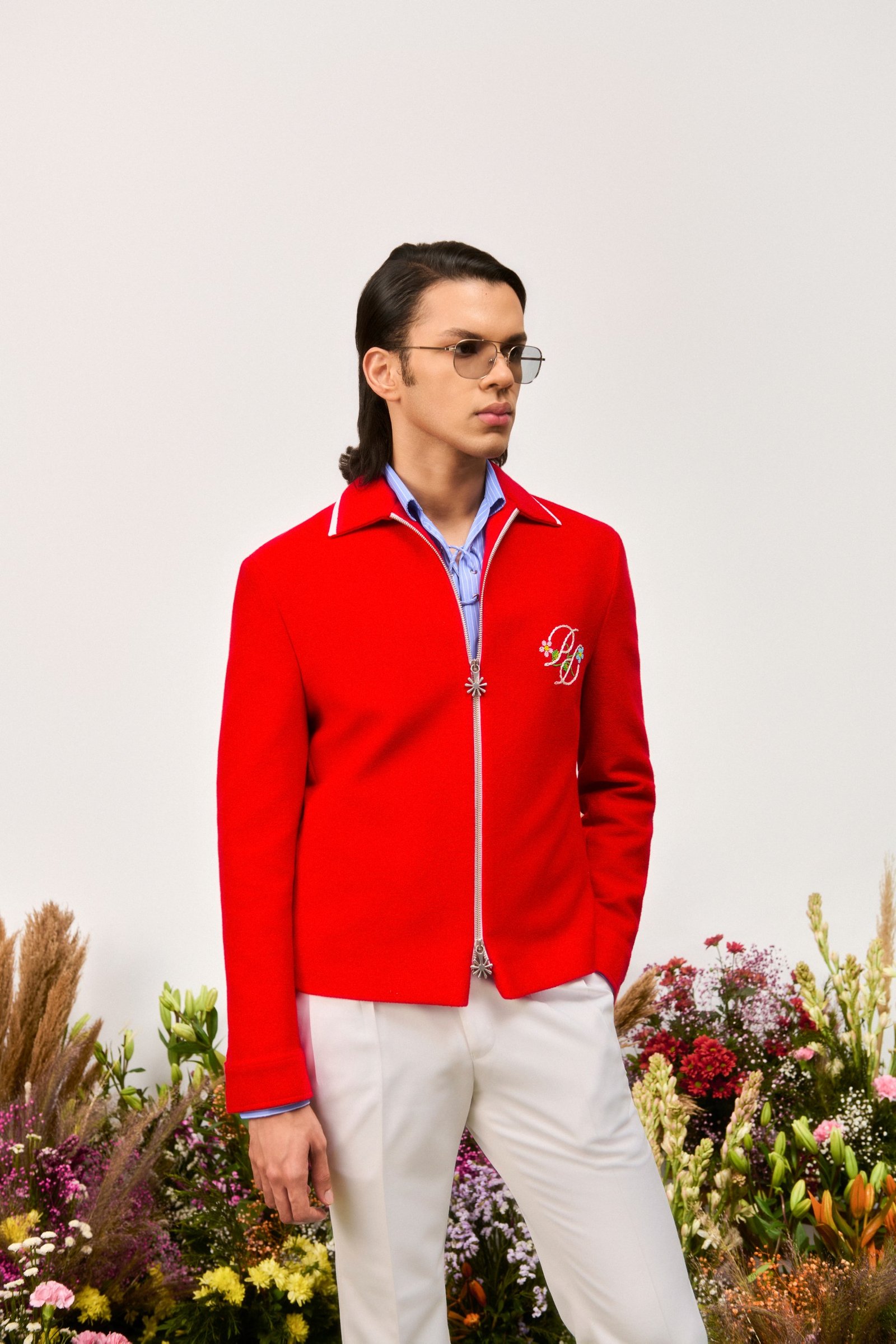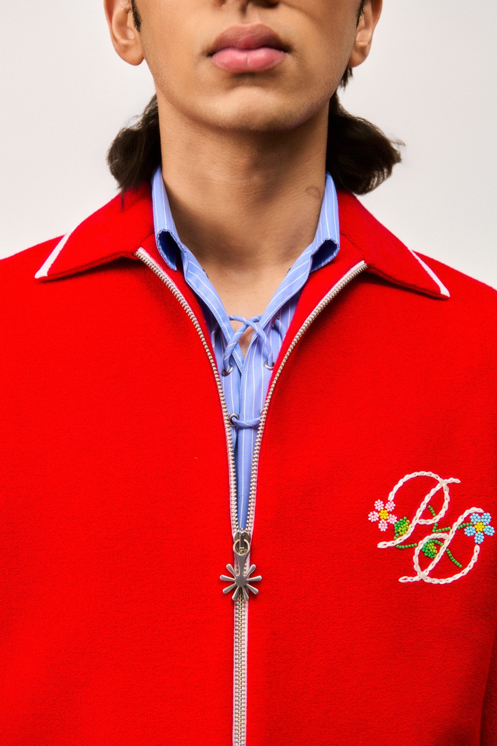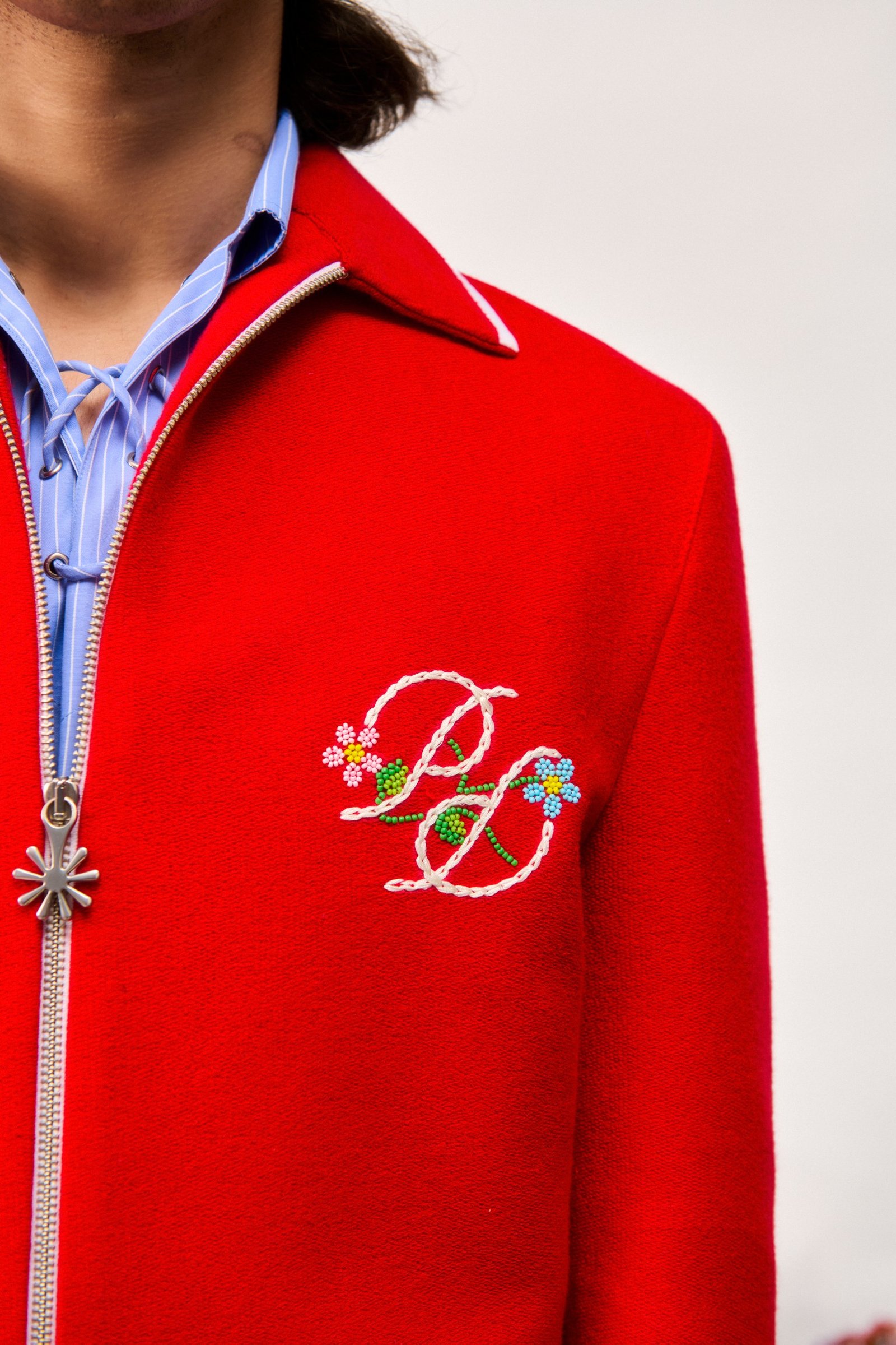 Crafted from 400 GSM french terry cotton in red, this jacket features a floral two-way zipper closure and the signature PD logo hand embroidered on the chest with beads and threads.