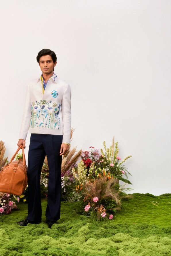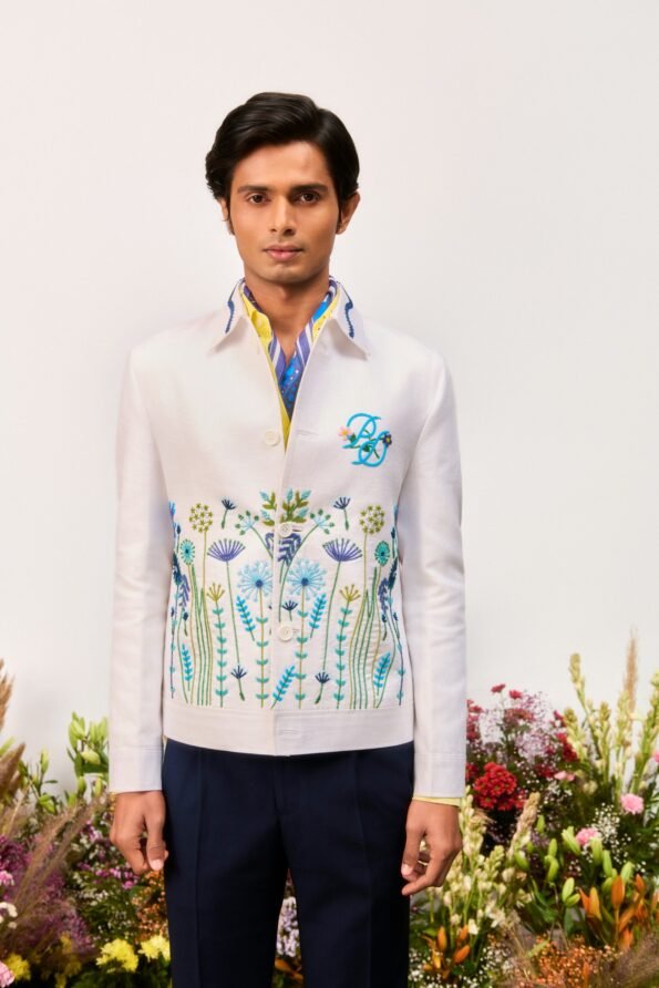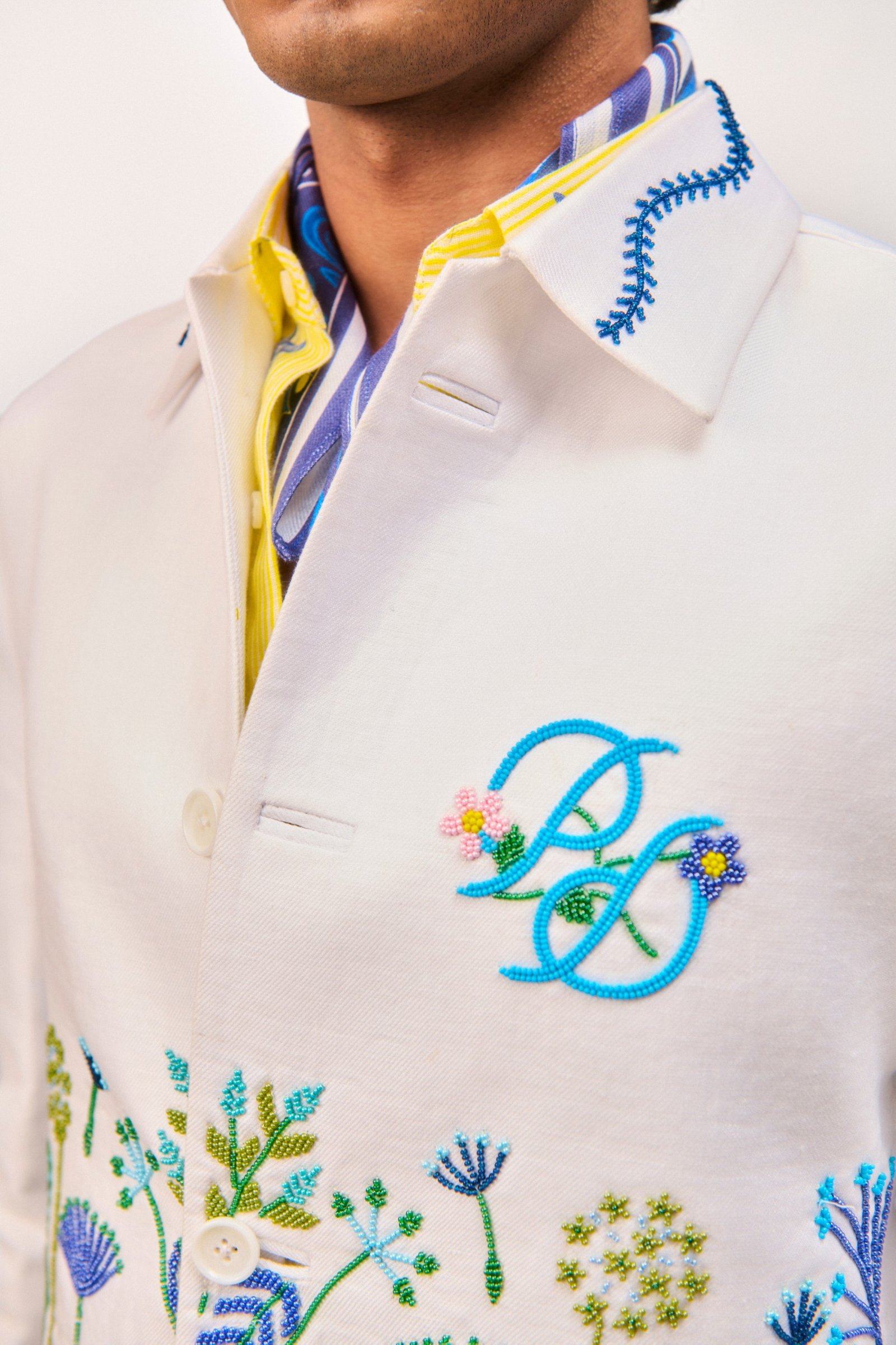 Crafted from 100% Suiting oxford linen, this jacket features floral hand embroidery created entirely using beadwork and has detailing of the signature PD logo on top crafted with colourful beads.